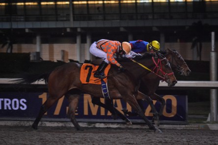 Ciudad de México.- El jinete Alberto Palacios, conocido en Las Américas como “El Lobito” salió con hambre de triunfo en la estelar de este sábado 17 de febrero de 2018 en el Hipódromo de Las Américas pues llevó a Gigi de Cuadra San Antonio al triunfo en la décima de la jornada al doblegar a su rival en el poste de meta por apenas una nariz de ventaja. Con ello el novel jinete, quien debutó en noviembre de 2017 logró su segunda victoria como profesional.