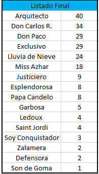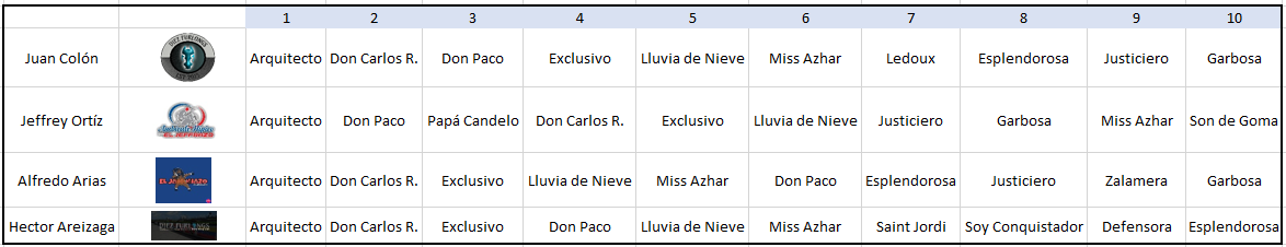 Este sí fue un listado más que acertado los 3 primeros con todo respeto nadie se los ganaba, don paco puso su nombre de respeto a retar a los importados y terminar 4, don Carlos R realizó la mejor carrera fuera de la isla en una carrera del Caribe, que decir de Arquitecto, extraordinario animal, las tres veces que salió fuera de la isla arribo en las 3 primeras posiciones, que caballazo Arquitecto, e visto la historia de los a grandes caballos de Puerto Rico a través de los años y si hay un top 10 no se puede dejar por fuera a Arquitecto reiteró un caballo de respeto dentro y fuera de la isla
